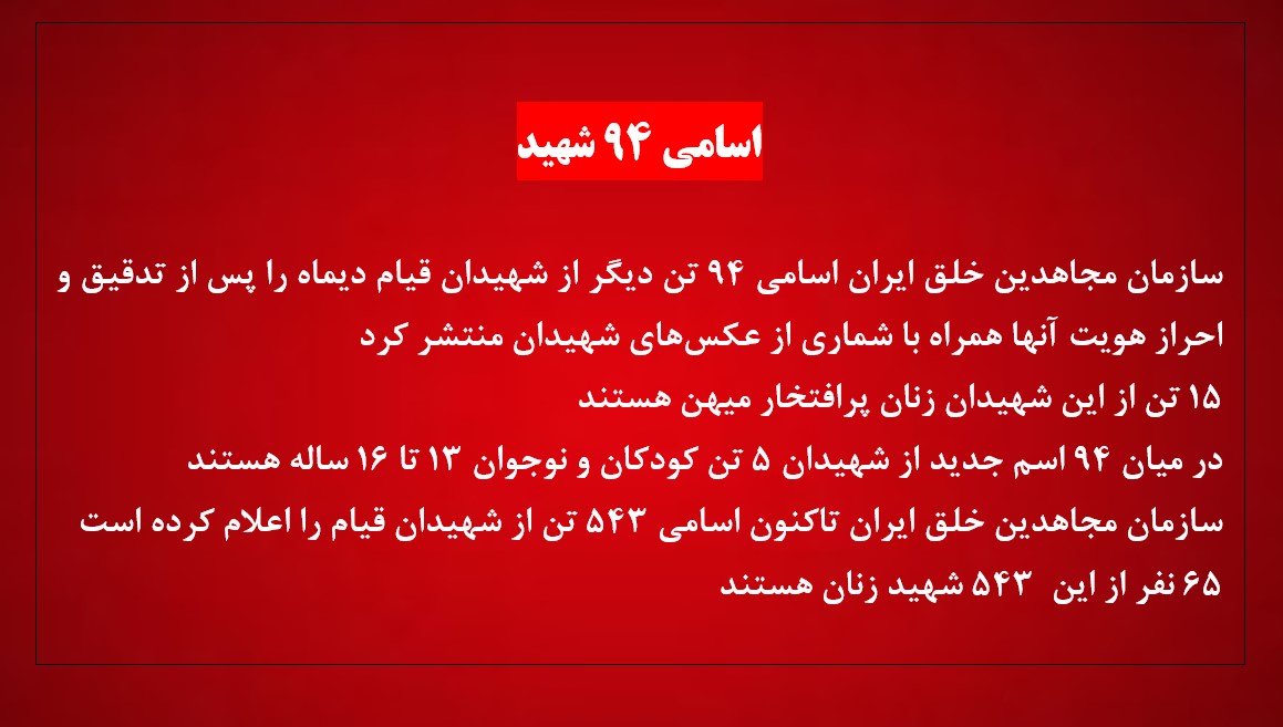 سازمان مجاهدین خلق ایران اسامی ۹۴ تن دیگر از شهیدان قیام دیماه را پس از تدقیق و احراز هویت آنها همراه با شماری از عکسهای شهیدان منتشر کرد