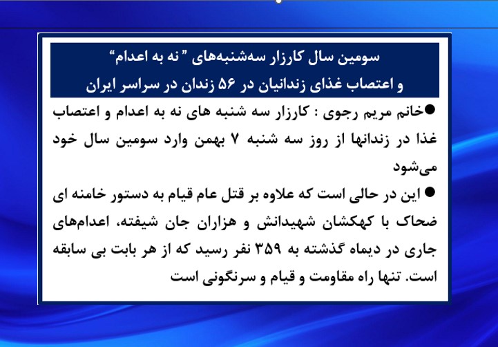 خانم مریم رجوی : کارزار سه شنبه های نه به اعدام و اعتصاب غذا در زندانها از روز سه شنبه ۷ بهمن وارد سومین سال خود میشود.