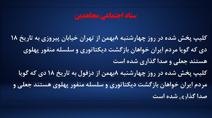 - کلیپ پخش شده در روز چهارشنبه ۸بهمن از دزفول به تاریخ ۱۸ دی که گویا مردم ایران خواهان بازگشت دیکتاتوری و سلسله منفور پهلوی هستند جعلی و صدا گذاری شده است.