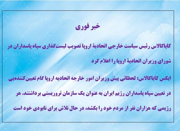 ایکس کایاکالاس: لحظاتی پیش وزیران امور خارجه اتحادیه اروپا گام تعیین‌کننده‌‌یی در تعیین سپاه پاسداران رژیم ایران به عنوان یک سازمان تروریستی برداشتند. هر رژیمی که هزاران نفر از مردم خود را بکشد، در حال تلاش برای نابودی خود است