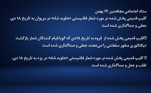 - کلیپ قدیمی پخش شده در مورد شعار فاشیستی «جاوید شاه» در یزد به تاریخ 1۸ دی، تقلب و جعل و صداگذاری شده است
