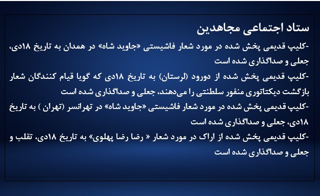 - کلیپ قدیمی پخش شده در مورد شعار فاشیستی «جاوید شاه» در همدان به تاریخ ۱۸دی، جعلی و صداگذاری شده است