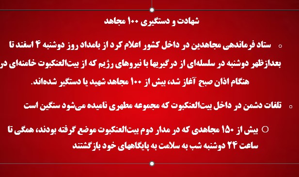 ستاد فرماندهی مجاهدین در داخل کشور اعلام کرد از بامداد روز دوشنبه ۴ اسفند تا بعدازظهر دوشنبه در سلسلهای از درگیریها با نیروهای رژیم که از بیتالعنکبوت خامنهای در هنگام اذان صبح آغاز شد، بیش از ۱۰۰ مجاهد شهید یا دستگیر شدهاند. تلفات دشمن در داخل بیتالعنکبوت که مجموعهٔ مطهری نامیده میشود سنگین است اما آمار دقیقی از آن در دست نیست اما تردد آمبولانسها تا ظهر دوشنبه به داخل بیتالعنکبوت با اسکورت یکانهای ویژه ادامه داشت بیش از ۱۵۰ مجاهدی که در مدار دوم بیتالعنکبوت موضع گرفته بودند، همگی تا ساعت ۲۴ دوشنبه شب به سلامت به پایگاههای خود بازگشتند. محل کار و سکونت مجتبی خامنهای، شورای نگهبان و خبرگان ارتجاع، دفتر مرکزی سردژخیم قضاییه جلادان، دفتر مرکزی وزیر اطلاعات، شورای عالی امنیت و تشخیص مصلحت نظام جنب بیتالعنکبوت در همین مجموعه مطهری قرار دارد که مساحت آن کمتر از نیم کیلومتر مربع است. ابعاد مجموعه مطهری که بیتالعنکبوت در قسمت شمالی آن است ۶۲۰ متر در ۷۷۰ متر است. محل استقرار خامنهای با نام دجالانه «بیت الزهرا» ۱۳۰ در۲۰۰ متر و محل سخنرانی او حسینیه خمینی ملعون با ابعاد ۱۰۰ در ۶۰ متر در همین «بیت» است. دور تا دور بیتالعنکبوت دیوار پیش ساخته از قویترین جنس بتون آرمه با ارتفاع بیش از ۴ متر و بر روی لبه دیوارها نردههای فلزی ضد پهپاد و پرتابه نصب شده است. در داخل مجموعه مطهری هرساختمان محوطه و دیوار اطراف خودش را دارد. در اطراف مطهری در ۱۷ نقطه دوربین دوار نصب کردهاند که با کمک نفراتی از داخل بیت العنکبوت تعدادی از آنها هنگام اذان صبح از کار افتاد. نزدیک به ۸ هزار نفر حفاظت بیتالعنکبوت و مطهری را در یکانهای گوناگون نظامی و اطلاعاتی بر عهده دارند. سرکرده کل آنها پاسدار سرتیپ حسن مشروعیفر معروف به امامی است. ۲ هزار نفر از سپاه حفاظت موسوم به ولیامر در این شمارند و ۲ هزار نفر دیگر از این سپاه در مجموعة ییلاقی دماوند و آبعلی و مصلای خمینی و کاخ ملکآباد مشهد هستند. خلبانها و خدمه هلیکوپترهای ویژه خامنه ای در همین سپاه هستند. مقر اصلی فرماندهی سپاه ولیامر در ساختمان چهارطبقه در جنوب بیتالعنکبوت قرار دارد. نفرات حفاظت خامنهای در بسیاری نقاط با عادیسازی حضور دارند اما همگی مسلح هستند. ناوگانی از خودروهای زرهی ضدگلوله تویوتا، لندکروزهای تقویتشده، خودروهای مرسدس بنز و بی ام و برای تردد خامنهای استفاده میشود مینیبوسهای ضدگلوله برای همراهان نیز قسمتی از خودروهای همین ناوگان است. حفاظت خامنهای دارای تجهیزات ضدجاسوسی: دستگاههای پیشرفته فرکانسیاب برای کشف شنود در محل سخنرانی و جمرهای قطع موبایل و خنثیسازی پهپادهای انتحاری است. سپاه ضد انصارالمهدی شامل ۲۷۵۰ نفر، حفاظت مدار ۲ و ۳ بیت العنکبوت را بر عهده دارد. مدار ۲ دایره به شعاع ۳۵۰ متر از بیت العنکبوت و مدار ۳ دایره ای به شعاع ۵۰۰ متر است. این سپاه حدود ۱۵ هزار پرسنل دارد و نیروی اصلی آن عناصر قابل اعتماد در سپاه پاسداران هستند. این سپاه حفاظت مقامات درجه یک، وزرا، امام جمعهها، استاندارها و سرکردگان بالای سپاه مانند قاآنی را بر عهده دارد. پاسدار سرتیپ اسدی سرکرده این سپاه است. این سپاه دارای یک یگان واکنش سریع به استعداد ۵۰۰ نفر است که در امور اطلاعاتی هم به آنها مأموریت داده میشود پدافندهای ضد هوایی در اطراف بیتالعنکبوت مستقر هستند.یکان ضد نبی اکرم از نیروی انتظامی شامل ۲۵۰ نفر حفاظت ورودیهای مطهری در مدار 2 را به عهده دارند یکانهای تقویتی حفاظت بیتالعنکبوت در مدار ۳ هشتصد نفر از تیپ تکاور امنیتی، یکان فاتحین بسیج و نیروهای سپاه در ناحیه سلمان فارسی در همین منطقه هستند. تیپ تکاور امنیتی ضد الزهرا مجهز به سلاحهای ضد اغتشاش،تفنگهای ساچمه ای، گاز اشک آور، شوکر و پینت بال است که افراد را علامت گذاری میکند یک گردان ۵۶۰ نفره از یکان ویژه انتظامی درشرایط قیام در مدار ۳ حفاظت بیتالعنکبوت مستقر است که دارای سلاح سبک و ضد شورش میباشد و در هماهنگی با تیپ تک