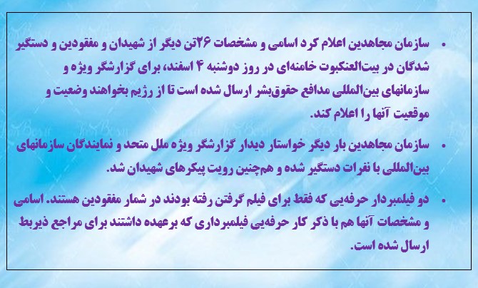 سازمان مجاهدین اعلام کرد اسامی و مشخصات ۲۶تن دیگر از شهیدان و مفقودین و دستگیر شدگان در بیتالعنکبوت خامنهای در روز دوشنبه ۴ اسفند، برای گزارشگر ویژه و سازمانهای بینالمللی مدافع حقوقبشر ارسال شده است تا از رژیم بخواهند وضعیت و موقعیت آنها را اعلام کند.