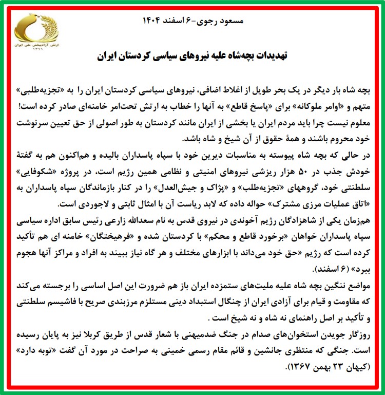 بچه شاه بار دیگر در یک بحر طویل از اغلاط اضافی، نیروهای سیاسی کردستان ایران را به «تجزیهطلبی» متهم و «اوامر ملوکانه» برای «پاسخ قاطع» به آنها را خطاب به ارتش تحتامر خامنهای صادر کرده است!