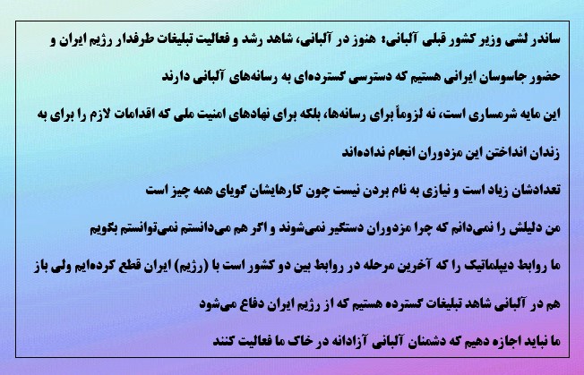 ساندر لشی وزیر کشور قبلی آلبانی:  هنوز در آلبانی، شاهد رشد و فعالیت تبلیغات طرفدار رژیم ایران و حضور جاسوسان ایرانی هستیم که دسترسی گسترده‌ای به رسانه‌های آلبانی دارند.