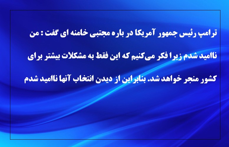 - ترامپ رئیس جمهور آمریکا در باره مجتبی خامنه ای گفت : من ناامید شدم زیرا فکر می‌کنیم که این فقط به مشکلات بیشتر برای کشور منجر خواهد شد. بنابراین از دیدن انتخاب آنها ناامید شدم