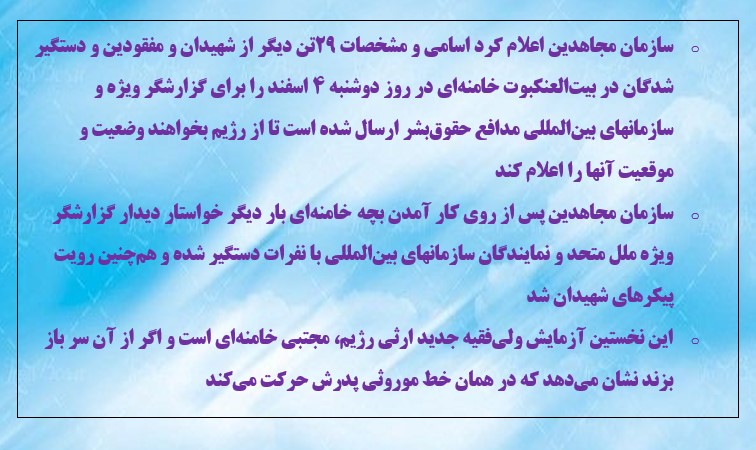- سازمان مجاهدین اعلام کرد اسامی و مشخصات ۲۹تن دیگر از شهیدان و مفقودین و دستگیر شدگان در بیتالعنکبوت خامنهای در روز دوشنبه ۴ اسفند را برای گزارشگر ویژه و سازمانهای بینالمللی مدافع حقوقبشر ارسال شده است تا از رژیم بخواهند وضعیت و موقعیت آنها را اعلام کند