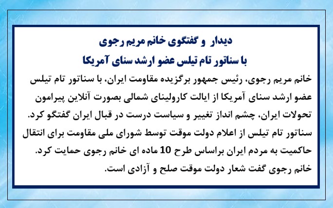 خانم مریم رجوی، رئیس جمهور برگزیده مقاومت ایران، با سناتور تام تیلس عضو ارشد سنای آمریکا از ایالت کارولینای شمالی بصورت آنلاین پیرامون تحولات ایران، چشم انداز تغییر و سیاست درست در قبال ایران گفتگو کرد.