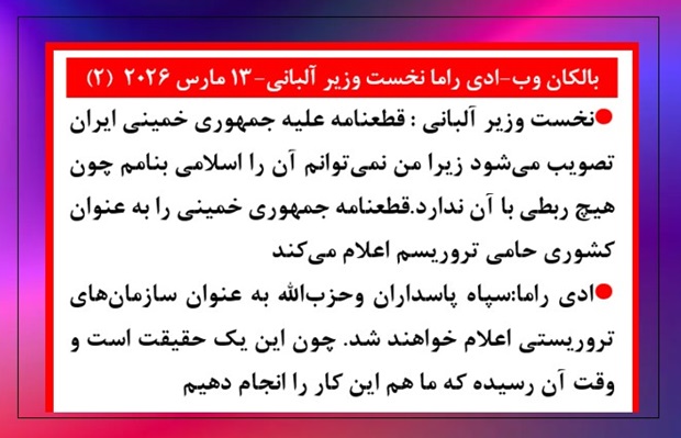 سایت بالکان وب، ۱۳ مارس اعلام کرد ادی راما نخست وزیر آلبانی هفته آینده از پارلمان این کشور دعوت می‌کند تا قطعنامه‌ای درباره ایران تصویب کند.
