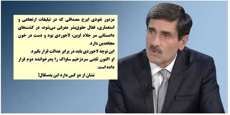 حسین داعی: مزدور نفوذی ایرج مصداقی که در تبلیغات ارتجاعی و استعماری، فعال حقوقبشر معرفی میشود، در گشتهای دادستانی سر جلاد اوین، لاجوردی بود و دست در خون مجاهدین دارد. این نوچه لاجوردی باید در برابر عدالت قرار بگیرد. او اکنون ثابتی سردژخیم ساواک را پدرخوانده دوم قرار داده است. نشان از دو کس دارد این بدسگال!