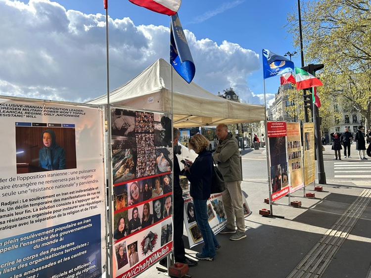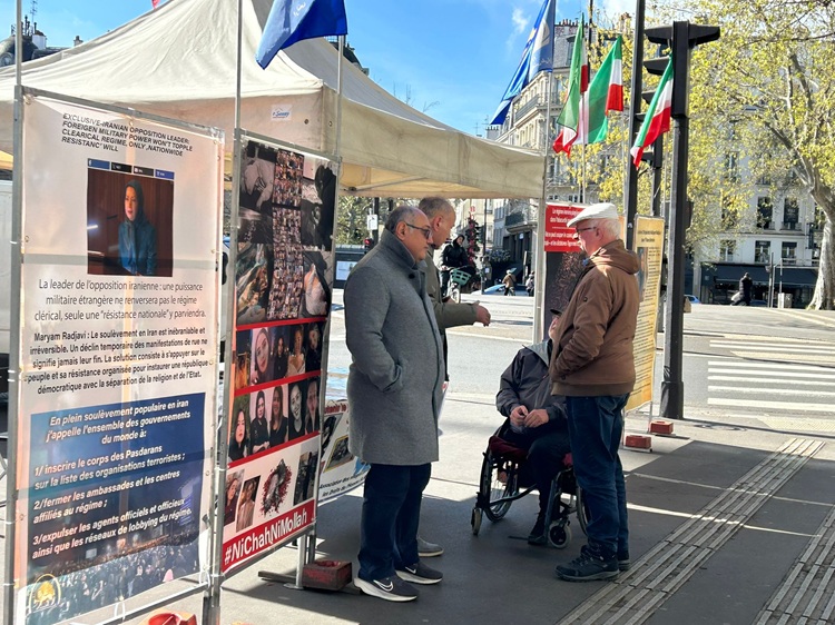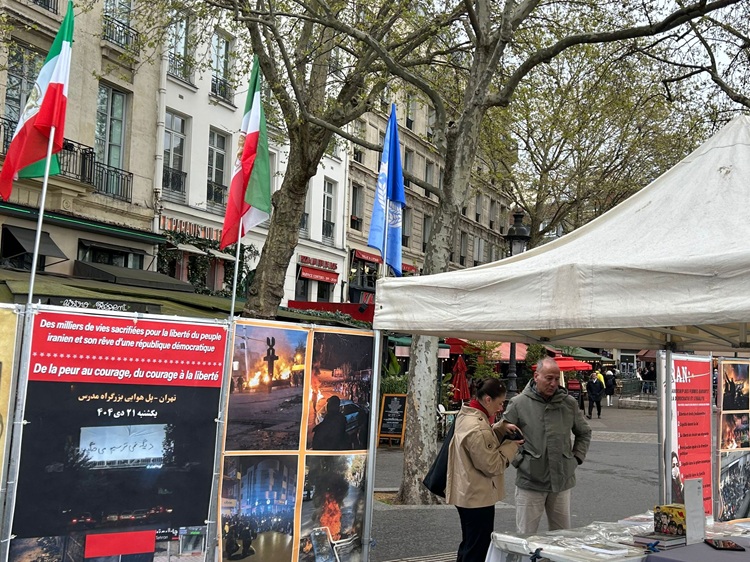 پاریس میز کتاب هواداران سازمان مجاهدین در حمایت از دولت موقت شورای ملی مقاومت با شعار صلح و آزادی