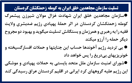 •سازمان مجاهدین خلق ایران شهادت غزال مولان شیرزن پیشمرگ کومله زحمتکشان کردستان در اثر حملة پهپادی رژیم ضدبشری ولایت فقیه را به رهبری و همرزمان و بستگانش تسلیت میگوید و بهبود دو مجروح دیگر حمله را آرزو میکند