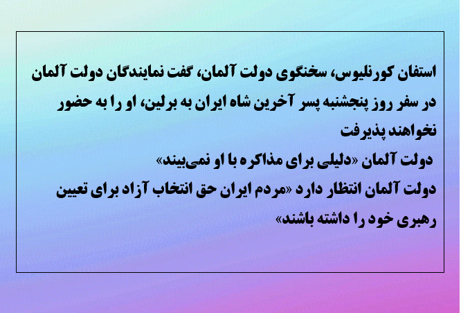 استفان کورنلیوس، سخنگوی دولت آلمان، گفت نمایندگان دولت آلمان در سفر روز پنجشنبه پسر آخرین شاه ایران به برلین، او را به حضور نخواهند پذیرفت