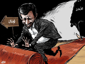 بر روی شبح سیاهی که پشت سر احمدی نژاد به طرف لبنان می آید نوشته: بحرانها