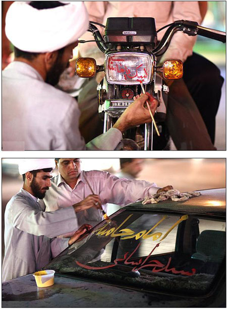 بسیجی های قم از صبح در خیابانهای شهر ماشین ها را متوقف کرده و شعارهایی برای استقبال از «امام خامنه ای» روی ماشینها می نویسند.