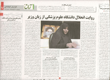 بنا به این گزارش روزنامه آرمان در صفحه 7 روز چهارشنیه 19 آبان ماه، گزارشی تحت عنوان"روایت انحلال دانشگاه علوم پزشکی از زبان وزیر" منتشر کرده که تصویر آن مربوط به مرضیه دستجردی وزیرربهداشت ودرمان است.که روی صندلی نشسته و پشت سر او تابلویی حاوی عکس مخدوش از خمینی دیده می شود.
