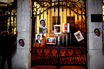 امشب در برابر سفارت ایران در پاریس تجمع کردند و پس از کندن تابلوی سفارت و شکستن تعدادی از شیشه های آن تصاویر این زندانی سیاسی و تصاویر دیگری از جمله علی صارمی، جعفر کاظمی ونسرین ستوده را بر در و دیوار آن چسباندند.