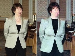 بسیاری از رسانه های ایرانی پس از مذاکره اشتون با سعید جلیلی دبیر شورای عالی امنیت ملی ایران برای بررسی پرونده هسته ای این کشور در استانبول هنگام چاپ تصویر خانم اشتون ، یقه لباس وی را با فتوشاپ بالا کشیدند.
