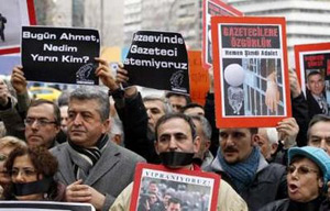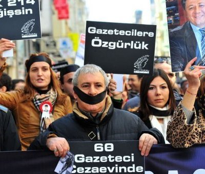 شرکت کنندگان در تظاهرات دیروز استانبول که عمدتا از روزنامه نگاران مخالف دولت اسلامگرای ترکیه بودند، پلاکاردهایی در دست داشتند که روی آن نوشته شده بود، روزنامه نگاران زندانی را آزاد کنید.