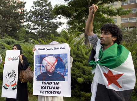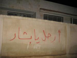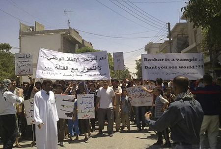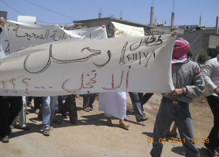 تظاهر کنندگان پلاکاردهایی را در دست داشتند که روی آنها نوشته شده بود ارحَل، بشار اسد باید برود.
