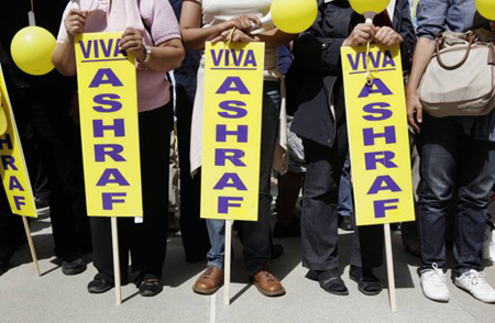 یک تظاهرکننده, مرد سالمندی با عینک, که او نیز به طور خاص از فرانسه آمده است, اظهار نظر می کند: “من اینجا برای دفاع از اشرف آمده ام”. او ضمن اشاره به مقر ملل متحد می گوید: “امیدوارم که آنها در آنجا گوشهایی شنوایی داشته باشند”.