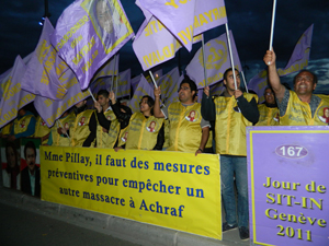 همچنین آکسیونی در مقابل مقر کمیساریای عالی حقوق بشر ، با سرود «مرزپرگهر» آغاز شد و سپس شعارهای کوبندهای برای تضمین حفاظت اشرفیان توسط تیم اعزامی ناظر توسط کمیساریای عالی حقوق بشر و کمیسر عالی خانم پیلای داده شد . شعارها که به سه زبان فارسی، انگلیسی و فرانسوی سر داده میشد، همراه با عکسها و باندرولها و پلاکاردها توجه بسیاری از عابرین را به خود جلب کرد. تعداد زیادی از شهروندان سوئیسی حمایت خود را از تظاهرات کنندگان ابراز کردند.