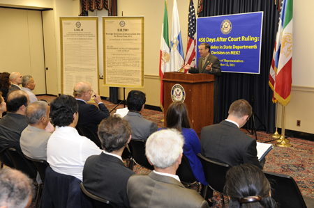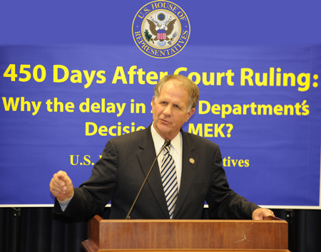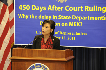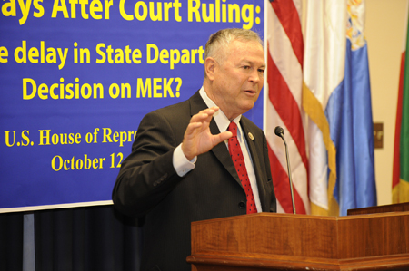 بگذارید قبل از اینکه پودیوم را واگذار کنم یک نکته بگویم. ما دو عنوان مختلف برای این جلسه خاص داریم، جلسه اصلی که فکر می کنم مناسب است می گوید: 450 روز بعد از حکم دادگاه در مورد اپوزیسیون ایران چرا وزارت خارجه قانون امریکا را نقض می کند؟ و امروز کمی دیپلماتیک تر است، چرا تاخیر وجود دارد؟ حالا بگذارید این را بگویم، من در یک پست ارشد در وزارت دادگستری و همچنین وزارت خارجه خدمت کرده ام و من ایده نقض قانون را بسیار جدی می گیرم، این یک اتهام بسیار جدی است، بنابراین نمی خواهم سخنان خودم را درباره نقض قانون بگویم. من صرفا می خواهم از حکم دادگاه، تصمیم دادگاه استیناف امریکا در 12 ژانویه 2010 نقل کنم که نتیجه گیری کرد "وزیر خارجه حفاظتهای روند منصفانه به مجاهدین خلق را نداده است" اینها حفاظتهای قانون اساسی امریکا هستند ,این تنها قانون اساسی امریکا نیست که آن را می خواهد بلکه قضاوتهای سابق دادگاه استیناف امریکا هم همین است. بنابراین باید این سوال را پرسید که چرا وزارت خارجه با مجموعه وکلایش از پیروی کردن از چیزی آن قدر ابتدایی که ما در کلاس حقوق در دبیرستان یاد گرفتیم، امتناع می کند. آیا این ربطی به تاخیری که ما دیده ایم دارد و من فکر می کنم این سوال بطور خاص امروز مناسب است، در حالی که ما اخبار مربوط به دخالت رژیم ایران در این توطئه وحشتناک برای ترور یک سفیر خارجی در خاک ایالات متحده را می شنویم. ممکن است ما از خودمان بپرسیم آیا هیچ ارتباطی بین همه اینها وجود دارد؟ من نمی گویم که وجود دارد ولی می گویم چیز عجیب و غریبی وجود دارد، که این همه طول می کشد که وزارت امور خارجه بخواهد به یک تصمیم گیری برسد، و روند منصفانه حداقل را ارائه کند. خوب، بسیاری از سوالات مطرح شده اند، و من بسیار خوشحالم که حالا جناب جودی چو، نماینده کنگره از حزب دمکرات از ایالت کالیفرنیا را معرفی کنم، او عضو برجسته کمیته قضایی مجلس نمایندگان است که در کمیته فرعی جرم و جنایت، تروریسم، و امنیت خدمت می کند. نماینده کنگره چو، بفرمایید.