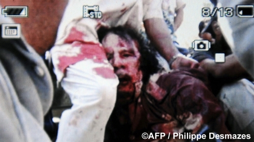 تصویری که مشاهده می کنید، تصویری است که تلویزیون ملی لیبی از مردی زخمی یا کشته را که به معمر قذافی شباهت دارد، مخابره کرده است.