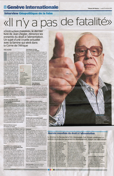 او زمانی که تراستهای بزرگ، لیبرالیزم وحشی و سیستم بانکی بین المللی را تقبیح می کند از هر زمانی راحت تر است. ژان زیگلر به نوعی پایان ناپذیر است او همیشه حی و حاضر است. وی به طور مرتب جوایزی دریافت می کند، مهمان افتخاری سمینارهای است که در چهار گوشه برگزار می شود و وقت هم برای انتشار کتابهایش پیدا می کند. آخرین اثر او، ”انهدام جمعی، ژئوپلیتیک گرسنگی“ قباحت سیستم را که بخشی از ساکنان کره زمین را محکوم به مرگ از گرسنگی می کند، افشا می نماید. او برخلاف انتظار کسانی عمل می کند که گمان می بردند که انقلابات عربی و مشکلات رژیم های که او برخی مواقع کمی بیش از حد رعایتشان را می کرد، وی را مجبور به سکوت خواهد کرد. حتی اگر چه او می پذیرد که برخی وقتها دچار اشتباه شده ولی روح وی همچنان سر کش است.