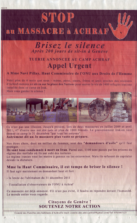 بیش از 6 ماه است که ما – مادران، پدران، خواهران، برادران و دوستان نزدیک ساکنان اشرف- برای نجات جان 3400 پناهنده ایرانی مستقر در این کمپ درعراق در میدان ناسیون دست به تحصن زده ایم وی شما همچنان در سکوت هستید !