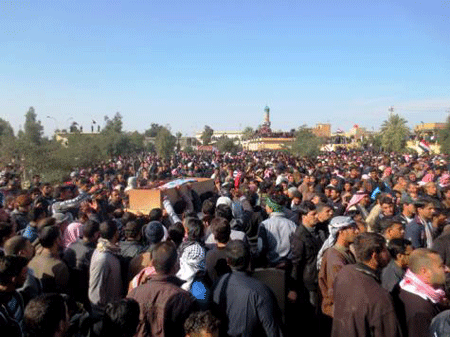 تلویزیون الجزیره 7 بهمن 1391 گزارش کرد لیست ائتلاف العراقیه نوری مالکی نخست وزیر عراق را مسئول قتل تظاهر کنندگان فلوجه دانست و از مالکی خواستار بیرون کشیدن ارتش و نیروهای مسلح از این منطقه شد. العراقیه همچنین از سازمانهای بین المللی، جامعه عرب، سازمان کشورهای اسلامی و سازمان ملل خواستار دخالت برای برقراری صلح در عراق شد.