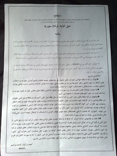 بسیجی های مزدور یک اطلاعیه بر علیه سیاست های کشور ترکیه در دفاع از انقلاب سوریه و علیه بشار اسد نیز منتشر کرده و در سطح تهران پخش کردند.