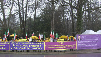 متحصنین در پلاکاردها و شعارهای خود وظایف و مسؤلیت های سازمان ملل و کمیساریای عالی پناهندگی را یادآوری کرده وخواستار تامین حفاظت و امنیت مجاهدین در اشرف و لیبرتی شدند.