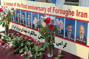 تظاهرکنندگان به مناسبت سومین سالگرد فروغ ایران با نثار گل در مقابل عکس شهدای این حماسه بزرگ ادای احترام کردند.