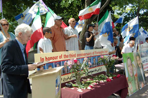 در این تظاهرات آقای دیوید کیلگور رئیس مشترک کمیته کانادایی دوستان ایران دمکراتیک به سخنرانی پرداخت و طی سخنانی موضع اخیر کوبلر و گزارش بی پایه و اساس او به شورای امنیت را به شدت محکوم کرد. وی در بخشی از سخنان خود به دو نامه اخیر تمامی ساکنین اشرف و لیبرتی به دبیر کل ملل متحد اشاره کرد و گفت باید حداقلهای انسان دوستانه برای ساکنین لیبرتی به سرعت فراهم شود در غیر اینصورت ساکنین اشرف با پای خود به زندان لیبرتی نخواهند رفت. وی همچنین به موضع به غایت غیر انسانی وزارت خارجه امریکا و مشروط کردن خروج از لیست مجاهدین به تخلیه اشرف و رفتن به زندان لیبرتی را محکوم کرد و گفت دولتهای امریکا و کانادا باید بلافاصله مجاهدین را همانطور که اتحادیه اروپا کرده از لیست تروریستی خود خارج کنند.