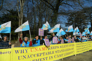 روز دوشنبه27 فوریه2012 مدافعان خستگی ناپذیر مجاهدان اشرف، تصویر سراسر واژگونه و دروغین از کمپ لیبرتی را محکوم و تن دادن مقامات سازمان ملل را به خواسته های غیرقانونی و ضدانسانی دولتی مالکی را تقبیح کردند.