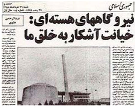 رژیم جهل و جنایت آخوندی که سرمایه های عظیمی را صرف ایجاد پروژه های اتمی و دستیابی به بمب اتمی کرده و آنرا حق مسلم خود میداند و تنها نیروگاه اتمی اش در بوشهر بعد از زلزله اخیر چشم انداز فاجعه ای نظیر و یا حتی خطرناک تراز انفجار نیروگاه اتمی فوکوشیمای ژاپن را در چشم انداز قرار داده است، 34 سال پیش در روزنامه جمهوری اسلامی آنرا خیانت به خلق خوانده و استدلال کرده بود که ایران با وجود ذخایر عظیم نفت و گاز نیازی به نیروگاه اتمی ندارد.