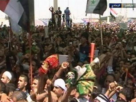 خطیب رمادی: پیام به مالکی کسی که در برابر عراق طغیان کرده و نسبت به خدا کفر می ورزد. ای مالکی، تو تمام درخواستهای ما را سوزاندی، با خدعه هایت، با وقت کشیهایت، و تجاوزت به میدان تحصن در حویجه و آنچه که در میادین میگذرد و آنچه که در ادارات میکنی، و یا اعدامهایی که انجام داده ای. ما سرباز حضرت محمد هستیم