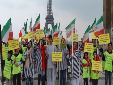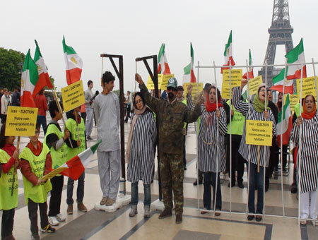 شرکت کنندگان با اجرای یک آکسیون بسیار زیبا که نقض حقوق بشر در ایران در سیاهچالهای قرون وسطایی رژیم ضد بشری آخوندی را تداعی میکرد، توجه وحمایت توریست ها وشهروندان مرکز پاریس را به خود جلب کرده بودند.