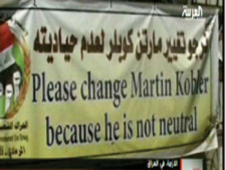 دریکی از پلاکاردهای بزرگ نصب شده در میدان تحصن تظاهر کنندگان جمعه مردم الانبارعراق که از سوی جنبش مردمی،در رمادی نصب شده بود، تظاهر کنندگان خواستار تعویض کوبلر به دلیل جانبداری وی از دیکتاتوری نوری مالکی و سکوت در قبال کشتار مردم، شدند.