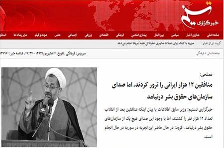 خبرگزاری سپاه تروریستی قدس تنسیم ـ 6شهریور1392:«مصلحی وزیر سابق اطلاعات با بیان اینکه مجاهدین بعد از انقلاب تعداد ۱۲ هزار نفر را کشتند، اما با وجود این، صدای هیچ یک از سازمانهای حقوق بشر در نیامد، افزود: در حال حاضر این تجربه در سوریه در حال انجام است.