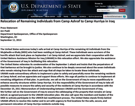 صبح امروز پنجشنبه 21 شهریور, پس از ورود 42 تن اعضای مجاهدین خلق ایران از اشرف به لیبرتی, وزارت خارجه آمریکا بیانیه زیر را منتشر کرد: