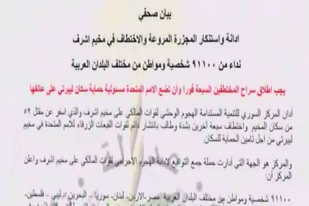 91100 تن از شخصیت ها و شهروندان از اقشار مختلف مردم در کشور های مصر-اردن- لبنان- سوریه – بحرین – لیبی – فلسطین- الجزائر- کویت و یمن با امضای بیانیه ها و ارسال نامه هایی خطاب به دبیرکل ملل متحد جنایت بیسابقه قتل عام ساکنان اشرف در 1 سپتامبر که منجر به کشته شدن 52 تن و به گروگان گرفته شدن 7 تن دیگر گردید را بشدت محکوم کردند.