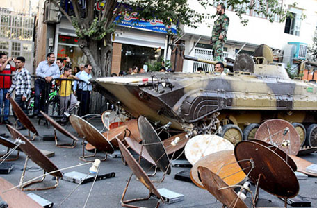 آخوند روحانی، رئیس جمهور فاشیسم دینی حاکم بر ایران، در روز چهار مهر در شورای روابط خارجی در نیویورک با دجالگری گفت «در ایران همه به راحتی به شبکههای ماهواره دسترسی دارند، حتی روی پشت بامهای هر روستایی آنتن ماهواره می بینید». دو روز بعد سپاه پاسداران در شیراز اعلام کرد 800دستگاه «آنتن و ریسور» دریافت شبکههای ماهواره یی را زیر چرخهای نفربرهای زرهی و غلطک «بطور نمادین » و به عنوان «اقدامی ارزشی برای مقابله با تهاجم فرهنگی دشمنان انقلاب و نظام» و «باحضور مسئولان استان و شهر شیراز» له کرده است.