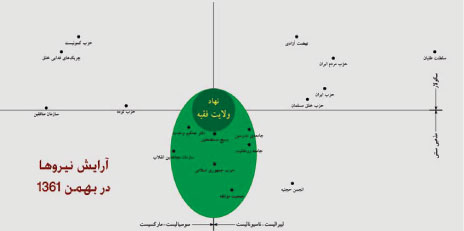 دیاگرامهای بالا بخوبی نشان میدهد که نیروهای ترقی خواه و انقلابی که حاضر نشدند ولایت سفیانی خمینی را بپذیرند و با او مرز بندی کردند از همان فردای 22 بهمن، خمینی با فالانژهایش به ستادهای آنها حمله کرده و در صدد حذف آنها برآمد. بطوریکه در کمتر از دوسال (چنانکه در دیاگرام دیده میشود) کل نیروی های مترقی از دایره حاکمیت حذف میشوند. بعداز 30 خرداد 60 با حذف بنی صدر کلیه نیروهای مذهبی را هم که زاویه با خمینی داشتند(حتی نهضت آزادی که خمینی آنرا دولت امام زمان نامیده بود)، یا مثلث بنی صدر، یزدی و قطب زاده که خمینی را از نجف به پاریس و از پاریس به تهران آوردند، حذف میشوند. یکی فراری شد، دیگری اعدام شد و سومی به حیات خفیف خائنانه – بقول مرحوم بازرگان – از حاکمیت حذف شد.