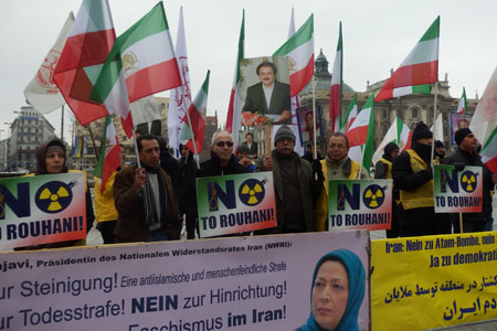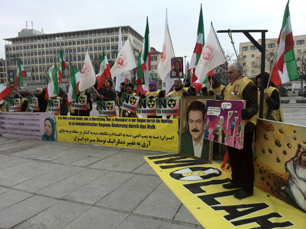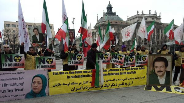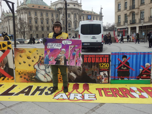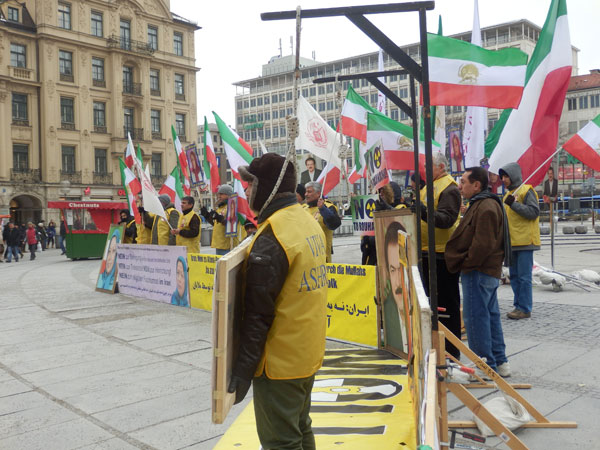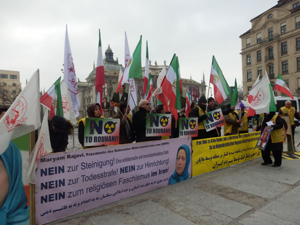 هنگام ظهر زمانی که اولین میهمانان در باریشن هوت (محل برگزاری کنفرانس امنیتی مونیخ) وارد می شوند، ایرانیان تبعیدی از شورای ملی مقاومت ایران در هوای 4 درجه زیر صفر بعنوان اولین تظاهرات کننده علیه «شرکت نماینده رژیم ترور» در میدان اشتاخوز (مرکز شهر مونیخ) ایستاده بودند. روز شنبه حضور وزیر خارجه رژیم ایران در مونیخ انتظار میرود. تظاهر کنندگان که در میان شان زنان زیادی شرکت داشتند. علیه سنگسار و اعدامهای فزاینده اعتراض کردند. تظاهر کننگدان برای نمایش اعدامها در ایران، یک چوبه دار در شاتاخوز بر پا کرده بودند.