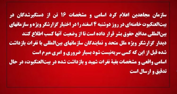 سازمان مجاهدین اسامی و مشخصات ۱۶ تن از دستگیرشدگان در بیتالعنکبوت خامنهای را در اختیار گزارشگر ویژه و سازمانهای بینالمللی مدافع حقوق بشر قرار داد.