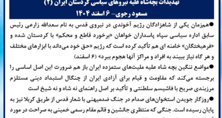 تهدیدات بچه شاه علیه نیروهای سیاسی کردستان ایران مسعود رجوی - ۶ اسفند ۱۴۰۴