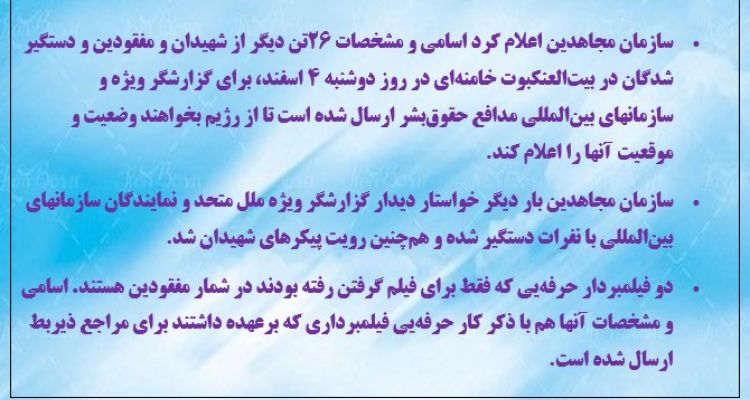 ارسال اسامی و مشخصات ۲۶تن دیگر از شهیدان و مفقودین و دستگیر شدگان در بیتالعنکبوت بهگزارشگر ویژه